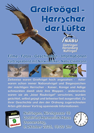 Wir laden zu einem spannenden Vortrag von Herrn Norwin Hilker vom NABU Cleebronn zum Thema "Greifvögel – Herrscher der Lüfte" ein. Der Referent ist Ornithologe und hält bereits seit vielen Jahren fachlich fundierte und anschauliche Vorträge mit vielen Bildern, die bei den Besuchern stets auf großes Interesse stoßen.